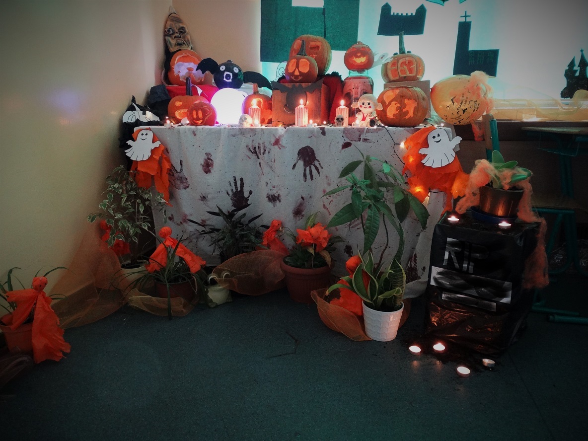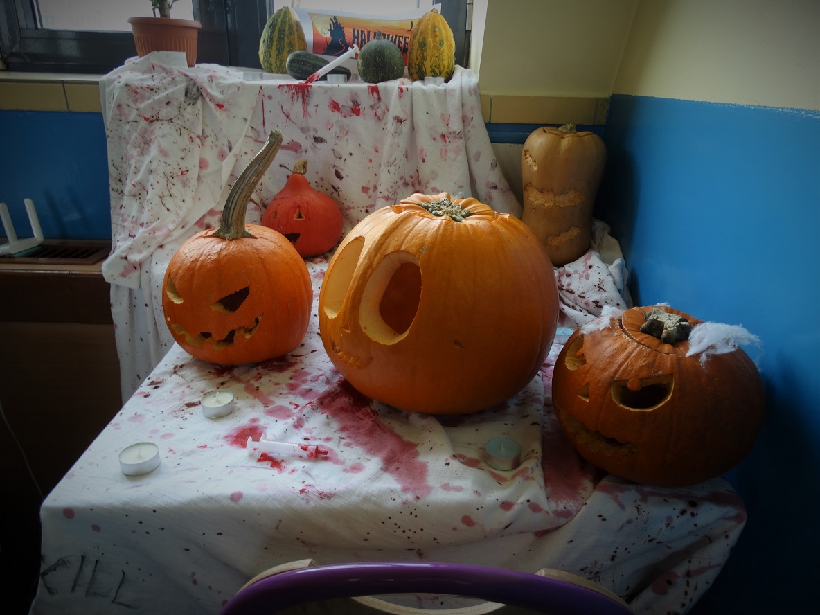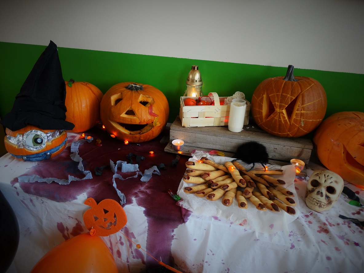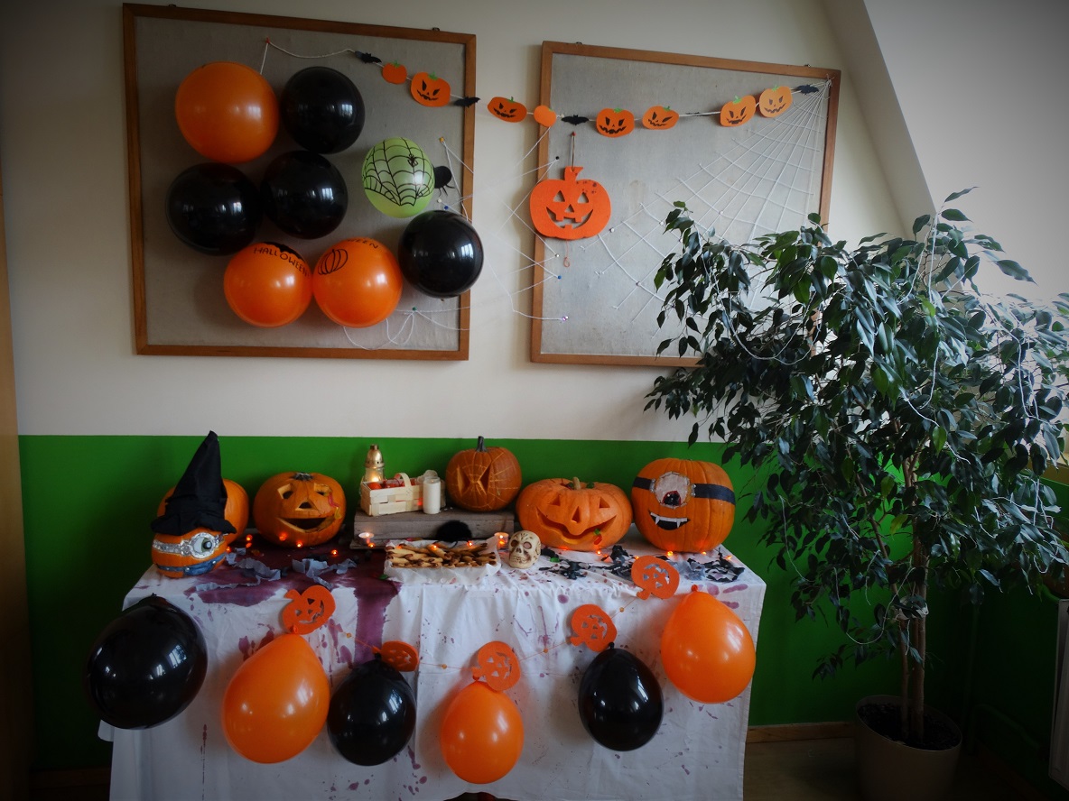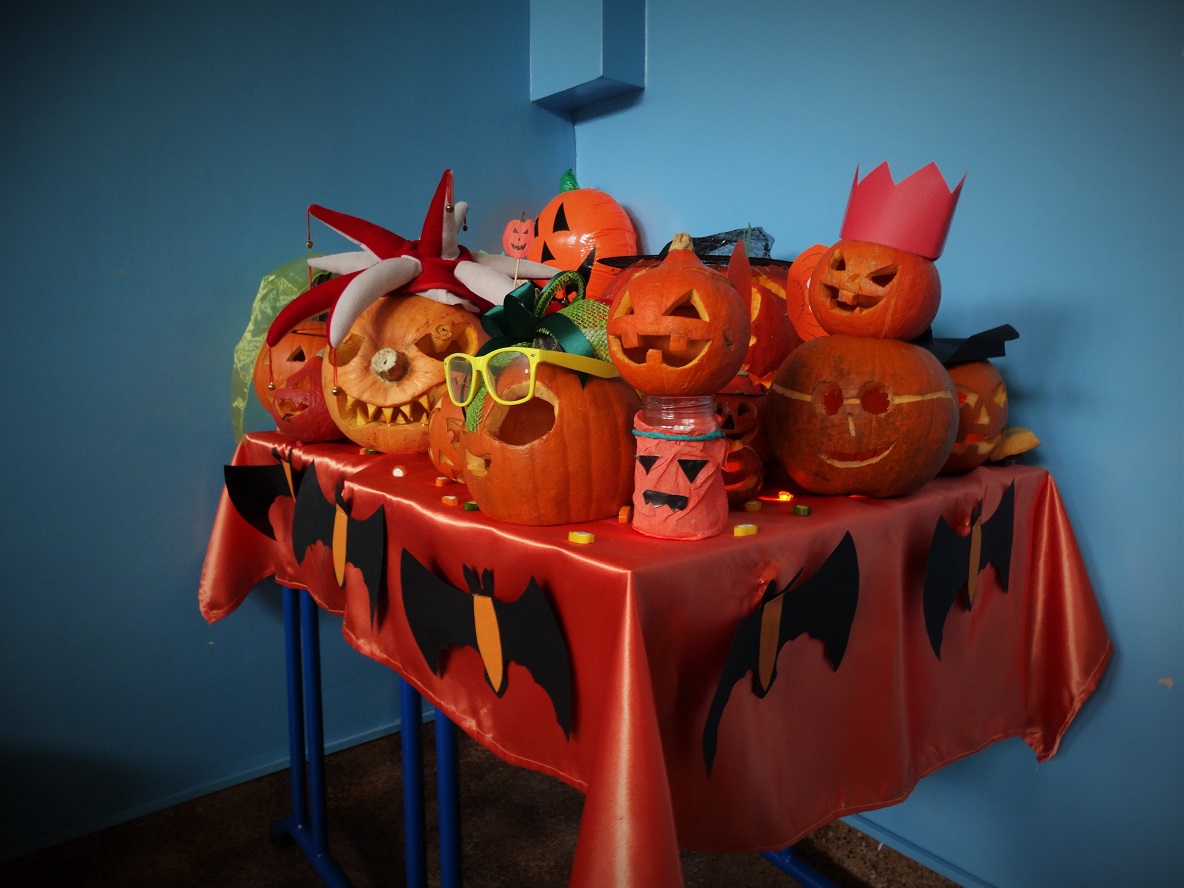 Kącik halloweenowy zadziwia. Każda klasa przygotowała klasowy kącik wymyślnych lub mniej wymyślnych rzeźbionych czy wycinanych dyń, a czasem także innych dziwnych przedmiotów. Dzisiaj, czyli w środę rozstrzygnięto, który kącik, według jury był najciekawszy. Wyniki i zdjęcia konkursowe: