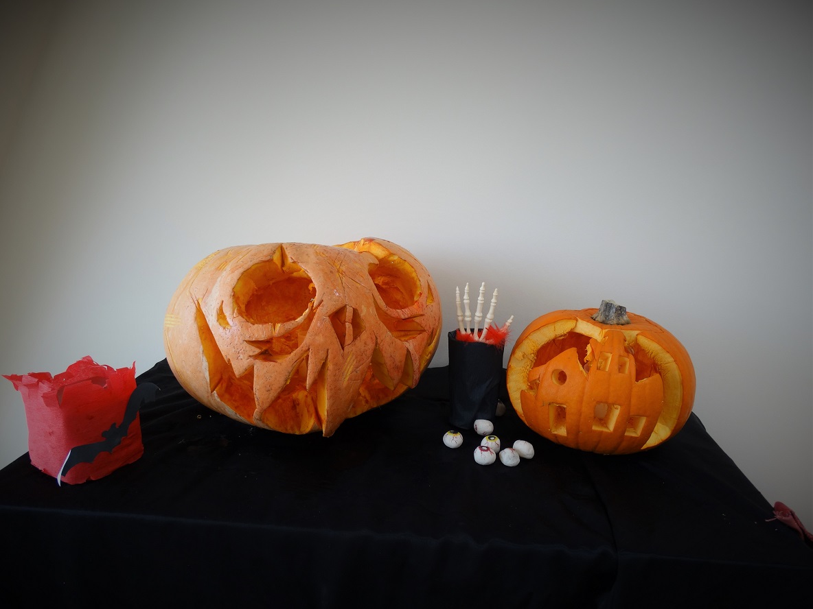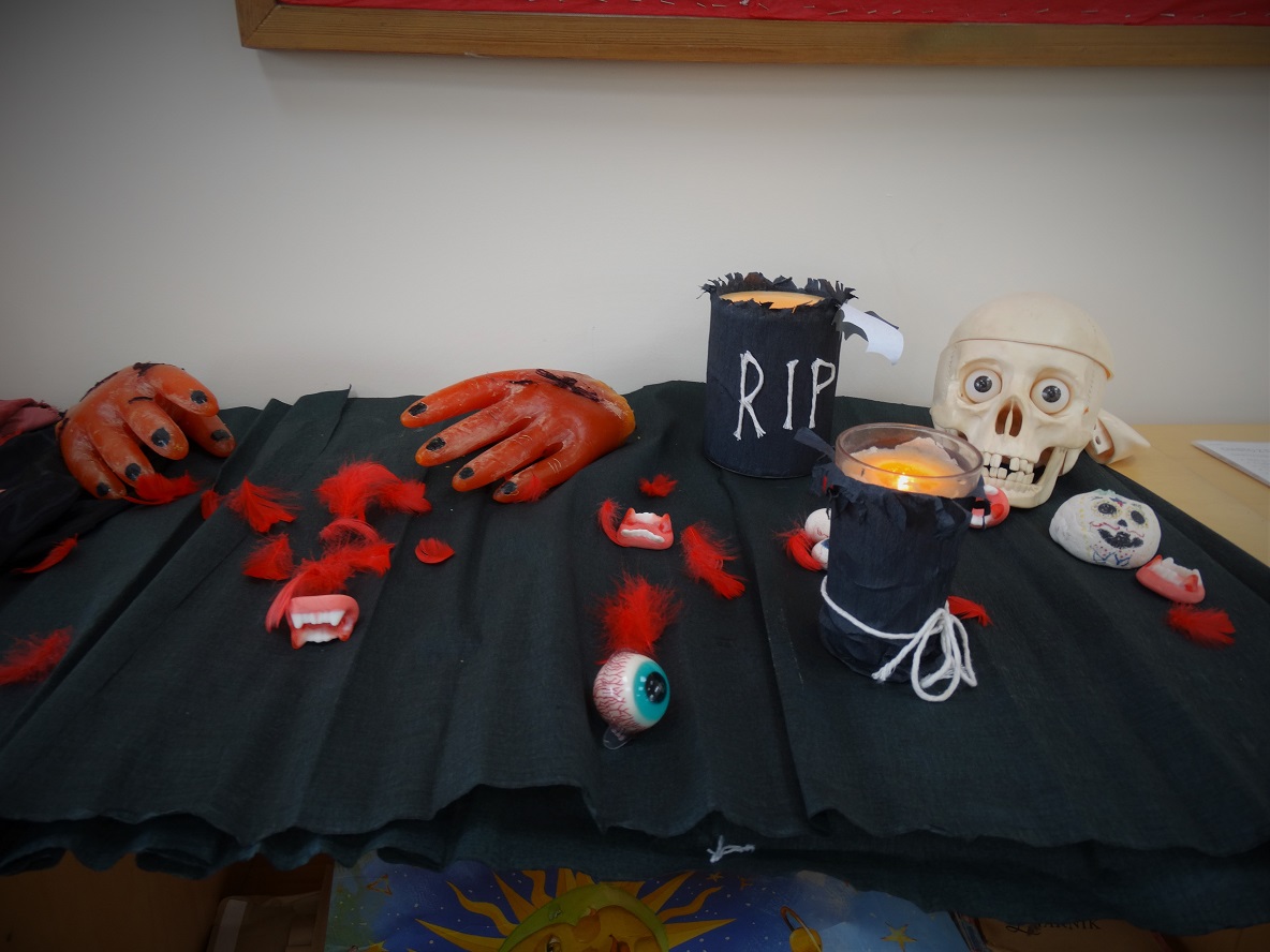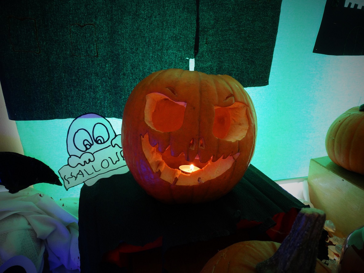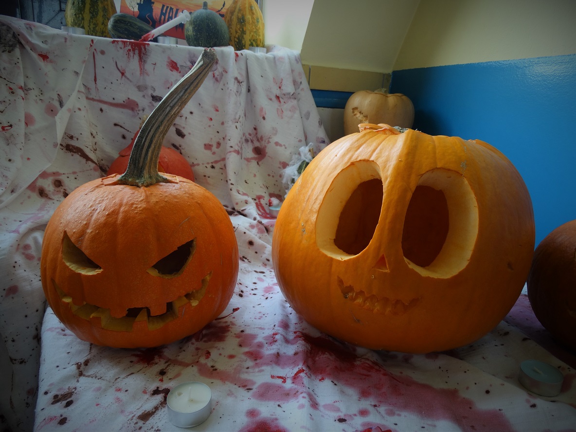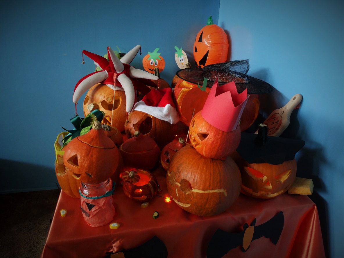 Kącik halloweenowy zadziwia. Każda klasa przygotowała klasowy kącik wymyślnych lub mniej wymyślnych rzeźbionych czy wycinanych dyń, a czasem także innych dziwnych przedmiotów. Dzisiaj, czyli w środę rozstrzygnięto, który kącik, według jury był najciekawszy. Wyniki i zdjęcia konkursowe: