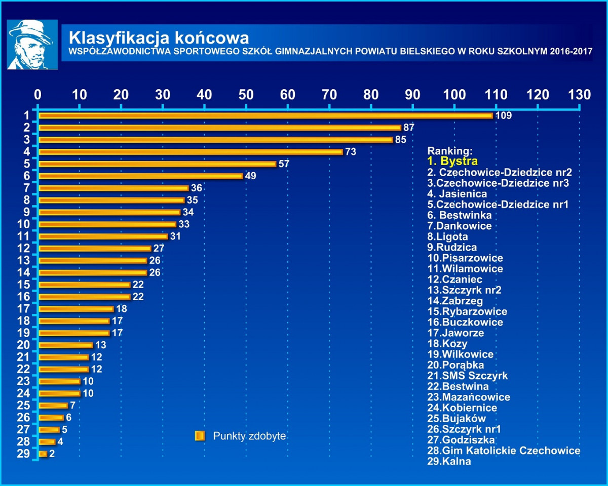 W dniu 29 października br. w Ligocie, miała miejsce Powiatowa Inauguracja Sportowego Roku Szkolnego 2015/2016. Po raz trzeci z rzędu, z rąk Starosty Powiatu Bielskiego Pana Andrzeja Płonki, Gimnazjum w Bystrej zostało uhonorowane okazałym pucharem za zwycięstwo w klasyfikacji ogólnej za najlepsze w Powiecie Bielskim osiągnięcia sportowe w roku sz...